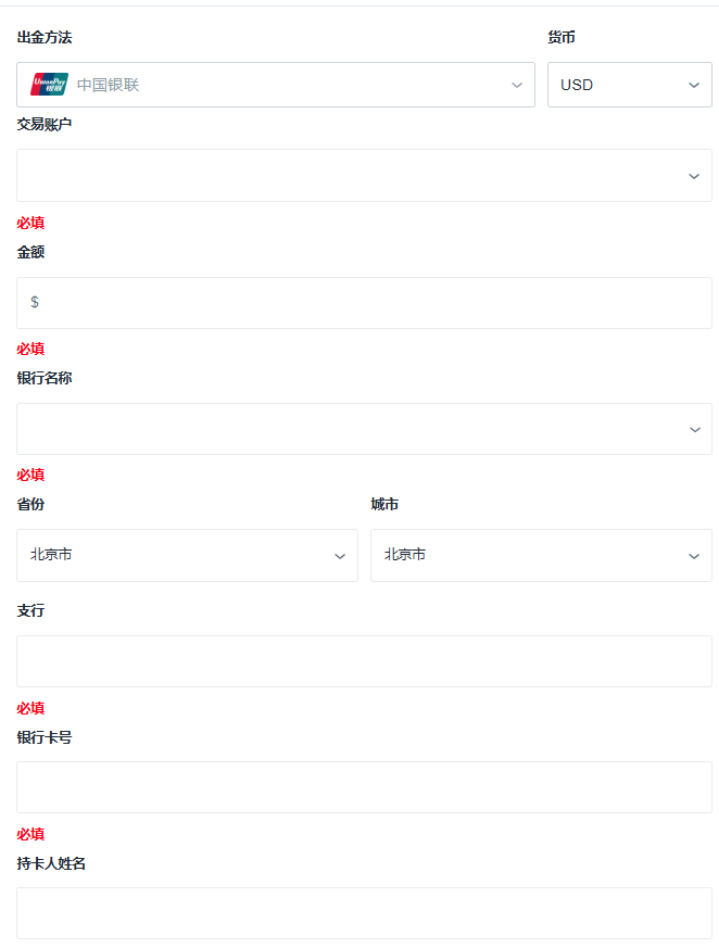 - 请填写取款金额、取款银行名称、取款银行地址、支行信息、银行卡号、持卡人姓名。