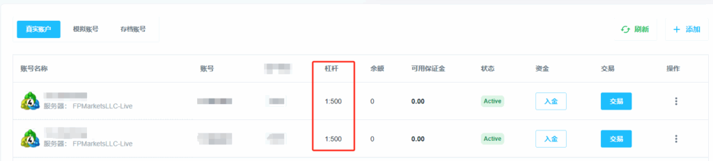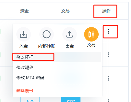 - 在右侧账号列表的”杠杆“列下您可查看到每个账号的当前杠杆设定。