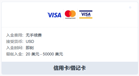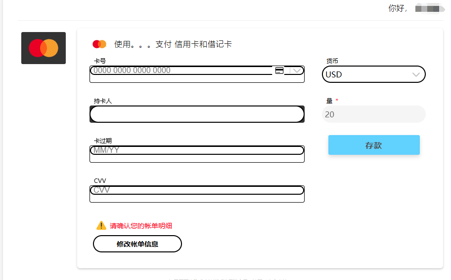 • 选择“信用卡/借记卡”作为存款方式。