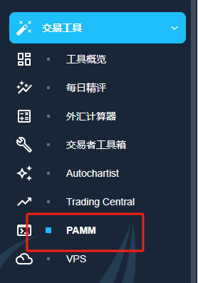 - 点击左侧菜单“交易工具”,会出现“市场分析”,“PAMM”,以及“VPS”选项。