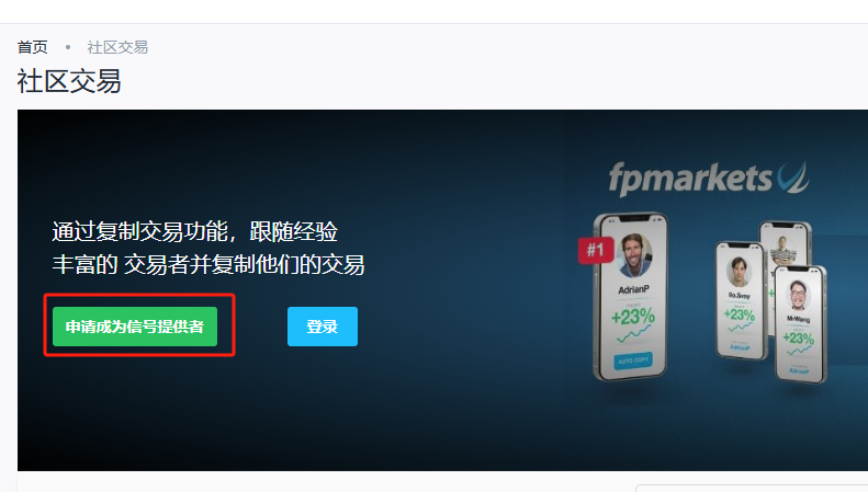 - 在右侧”社区交易”页面中找到并点击绿色的“成为信号提供者”按钮。