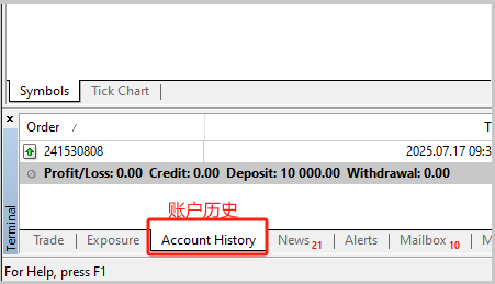 1. 请打开 MT4/5 软件,在下方菜单找到“账户历史”选项卡。
