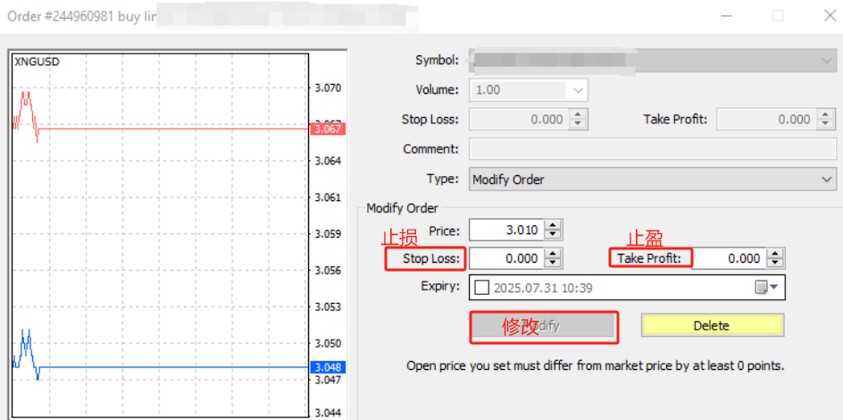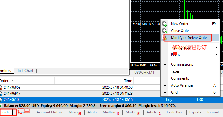 - 在页面下方“订单”窗口中,右键点击需修改的持仓订单,在弹出的窗口选择“修改或删除订单”。