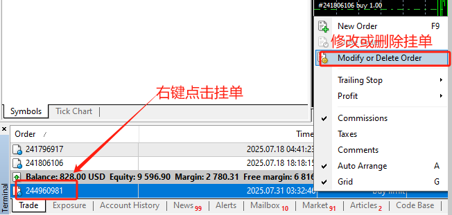 - 在页面下方“订单”窗口中,右键点击需修改的挂单订单,在弹出的窗口选择“修改或删除订单”。