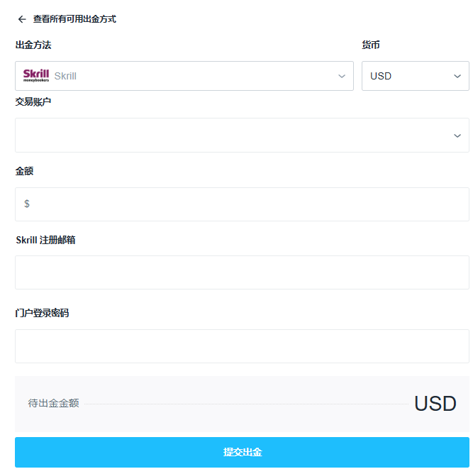• 请选择取款账号,填写取款金额,填写您的 Skrill 账号注册邮箱。