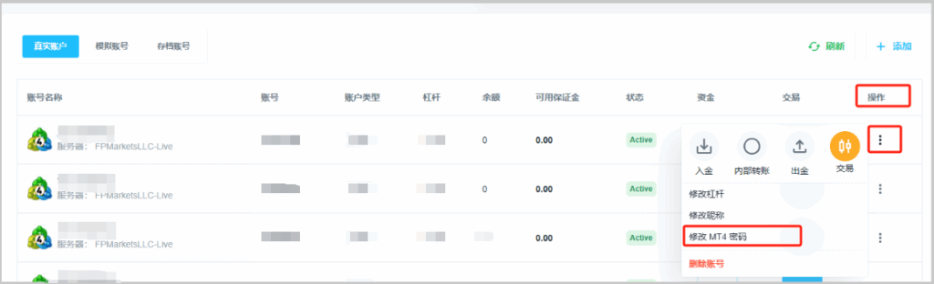 - 在页面右侧,点击所选交易账号最右端的三个圆点图标,并在下拉菜单中选择“修改 MT4/MT5 密码”。